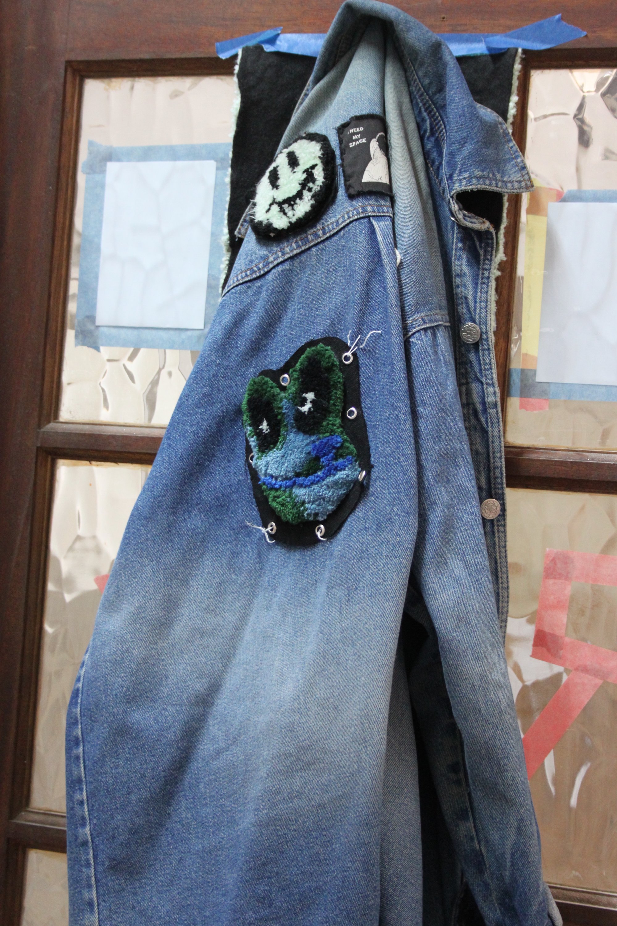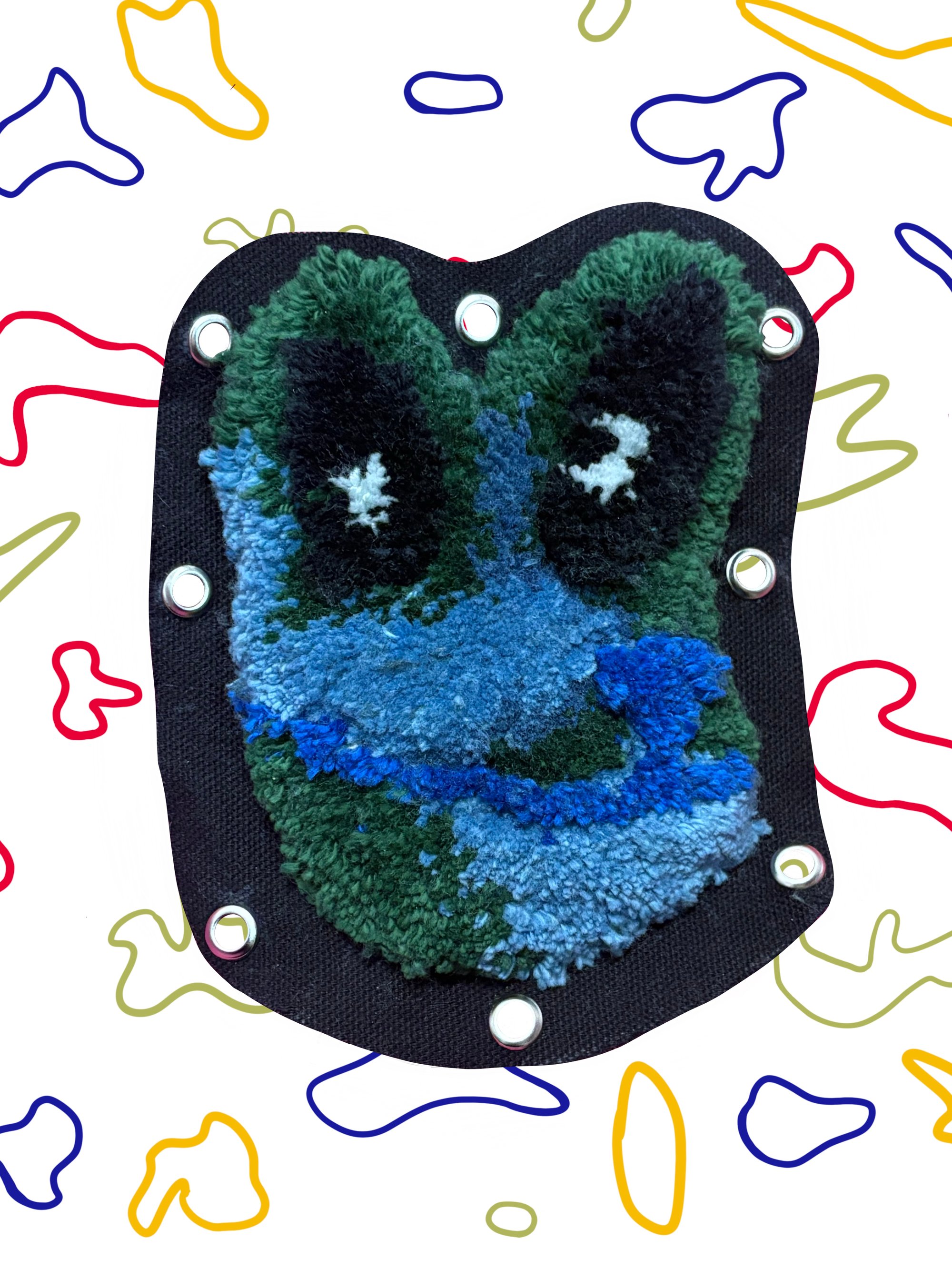 A cool toned, colourful tufted frogs head with a cotton canvas backing and eyelets around the edging.
